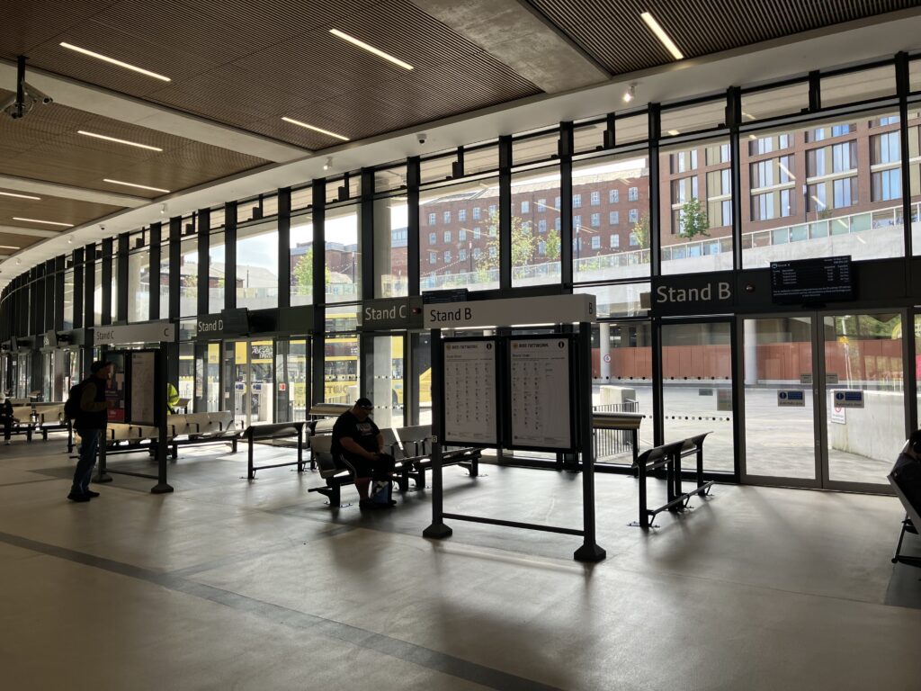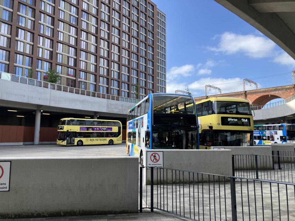 近年では、バスターミナルのリニューアルも進められています。マンチェスター南部のStockportでは、2024年に住宅再開発とセットで新しいバスターミナルが建設されました。1億4000万ポンドが投じられた新しいバスターミナルは2層建てで、下層には19のバスバースと待合所、チケット売り場、売店があり、上層には鉄道駅や川沿いに接続する歩行空間と高層住宅のエントランスがあります。2025年6月には、トラムの乗り入れ計画が発表されました。