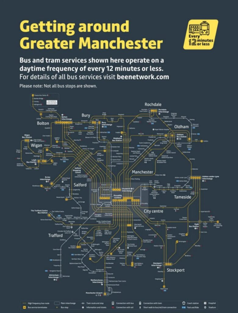 ③New Bee Network map reveals high frequency bus and tram routes together for the first (2025.3.15 TfGM)