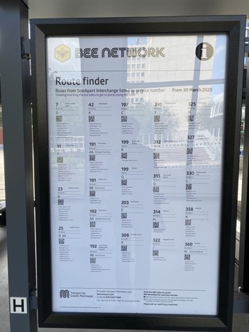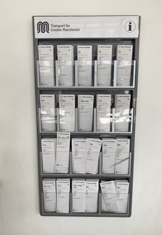 Stockport Interchangeには24系統が接続し、時刻表は系統毎にQR確認(左)と紙版(右)で誰も取り残さない工夫がされている(出典①)
